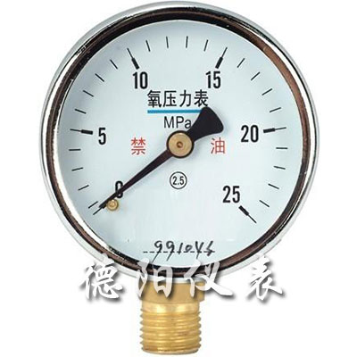 氧气压力表适用测量氧气介质的压力。严禁接触油脂类物质。